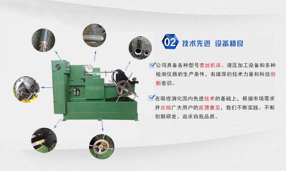 本套絲設(shè)備屬于無削加工設(shè)備,運用特殊的切削技術(shù),上絲輕盈快捷,提高生產(chǎn)效率,采用三點一線,同心度高,性能穩(wěn)定等優(yōu)點,本機每分鐘可切削3-5根工件,速度快,效率高,對于一些不定長度的鋼結(jié)構(gòu)公司,橋梁工程,電力設(shè)施等大企業(yè)的批量生產(chǎn)之需要。
